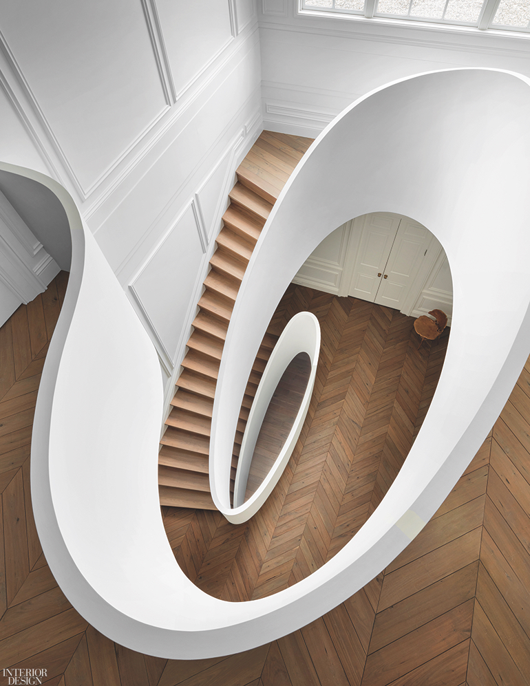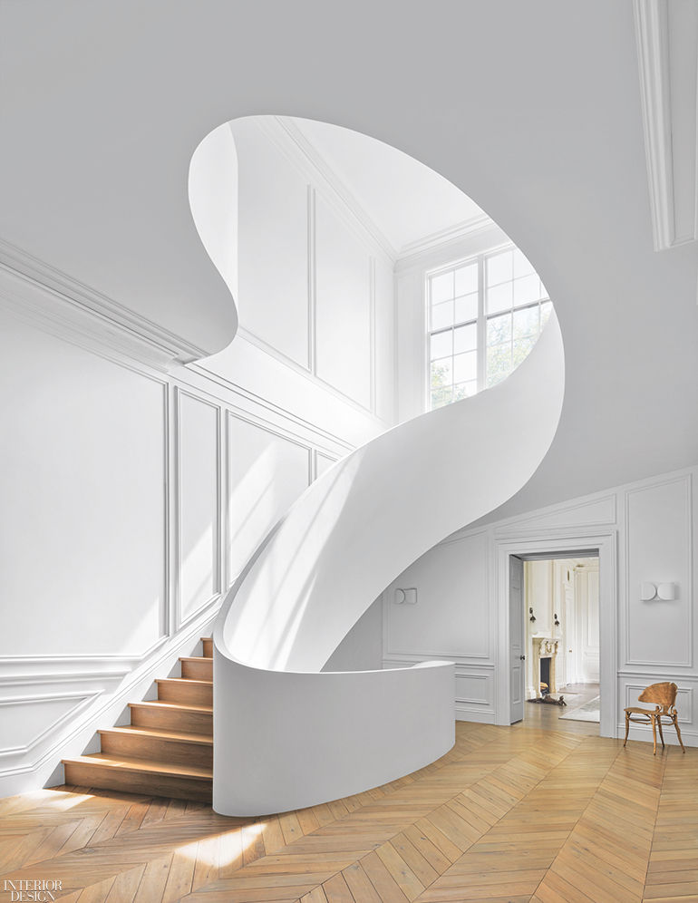 在整个过程中,新的墙板和模制品涂成白色,而镶木地板则是胡桃木。家具的规模受到限制,为房间带来亲密感,大约20英尺乘20英尺。然而,不受约束的是中央大厅楼梯。更换强劲的橡木版本是一个俯冲的石膏表面椭圆形,哈里斯的标志。“这让我想起了一些解开的东西,”他说道,同时也注意到勒·柯布西耶楼梯在查尔斯·德贝斯特吉的巴黎公寓中的影响。但在这里,登陆处的新窗户望向新英格兰的树叶。