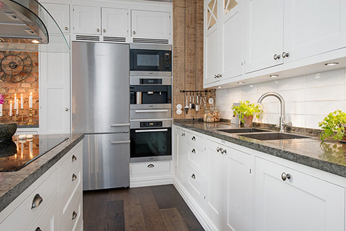 厨房除了在橱柜水盆用水比较多以外,其余地方用水不多,但是厨房防水仍然是必须要重视的问题。厨房防水主要是确保水盆的位置和地面的倾角。水盆最关键的是要做好接口的防水,一些业主认为用组合式橱柜可以避免这个问题,其实不然。用夹板制成的橱柜受水可以通风晾干,但是组合式橱柜遇水就会膨胀,容易导致表面防火板层脱离。