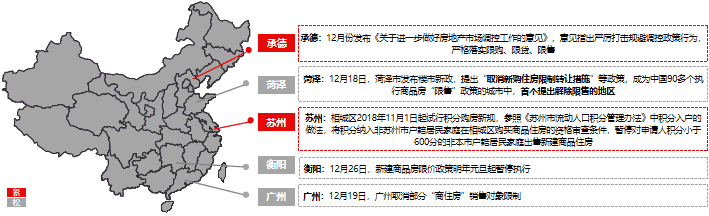 2018年各地出台房地产相关政策超过400次房地产市场高位回落不断降温。7月31日中央政治局会议“遏制房价上涨”的表态之后房价上涨预期逐渐被打破观望情绪占据主导三季度开始改善型和投资型需求也开始快速退场。 自11月份开始伴随楼市降温各地调控政策出台频次骤减调控不再继续加码。在此背景下菏泽成为第一例标志性的松绑调控城市是楼市政策从紧到宽松的重要变化。这一政策会造成示范效应在因城施策的政策框架下后续类似的政策放松还会继续增多尤其是从限售政策进行松绑。 当前中国经济下行压力加大外需不振而房地产业拉动其它行业的效应显著。因城施策将是明年房地产政策关键。