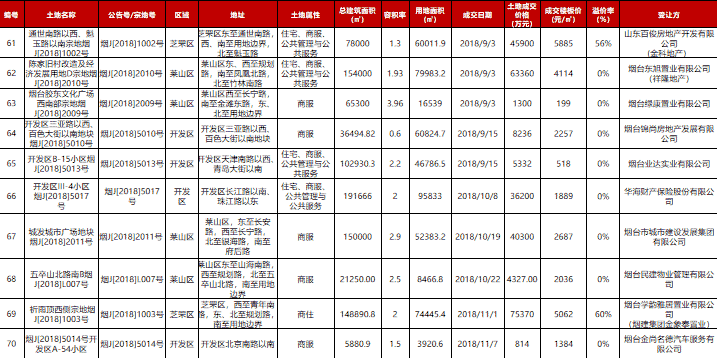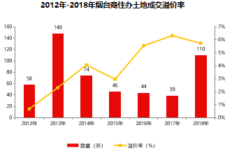 2018年土地成交楼板价再创新高其中超5000元/㎡的地块为烟台传化公路港福山商业地块、龙湖只楚、中海喜乐酒店、远洋四季苑、金科通世南路、烟建祈雨顶地块 2018年全市成交土地的平均溢价率5.7%溢价率超50%的高溢价土地主要是龙湖只楚、中海上庄、远洋四季苑、金科通世南路、烟建祈雨顶地块占土地总宗数的4.5%。从整体情况来看底价拿地为今年市场主旋律。