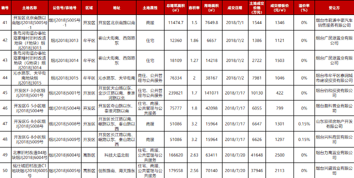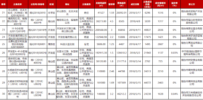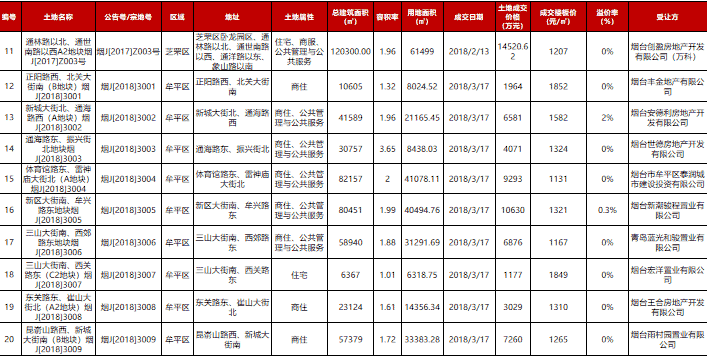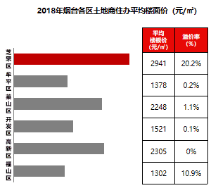 今年开发区土地成交面积最大共计30宗286万㎡占成交总量的29%芝罘区平均成交楼板价最高为2941元/㎡溢价率为20.2%。