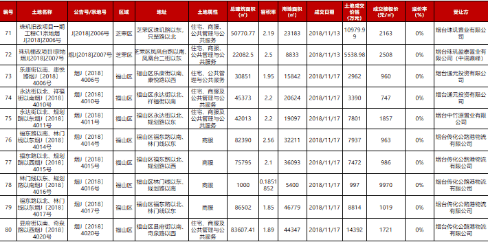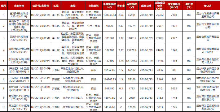 【成交建面最大/成交总价最高】烟台鲁商地产有限公司于1月29日以7.9亿元购得莱山区J[2017]L015号地块成交建面37.16万㎡是2018年成交建面最大、成交总价最高的地块。