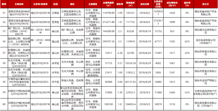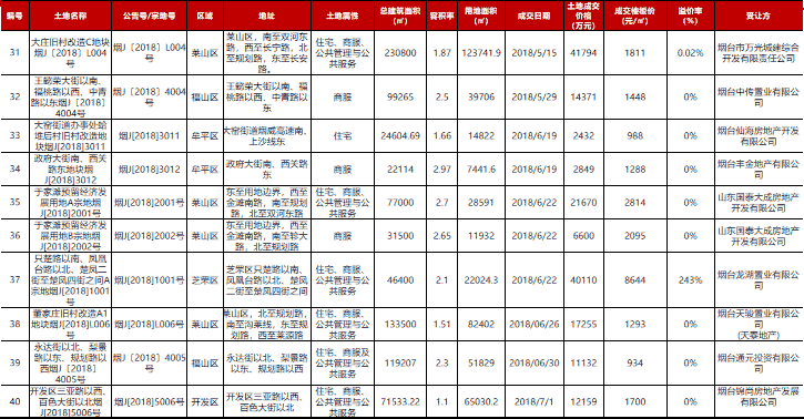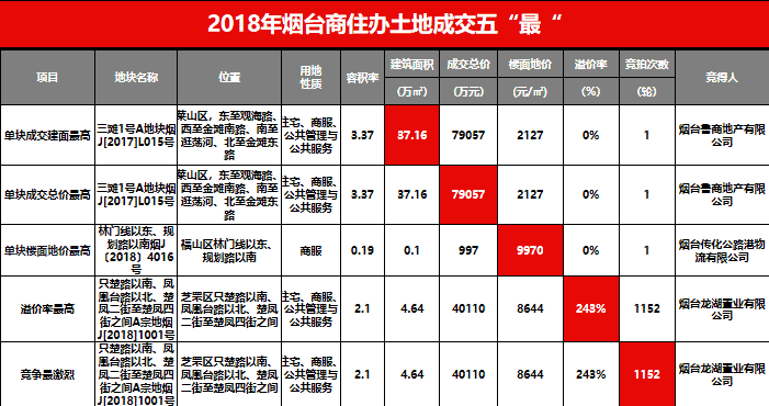 【溢价最高/竞拍次数最多】烟台龙湖置业有限公司于6月22日以4亿元购得芝罘区烟J[2018]1001号地块溢价率高达243%竞拍次数1152轮是2018年溢价率最高、竞争最激烈地块。