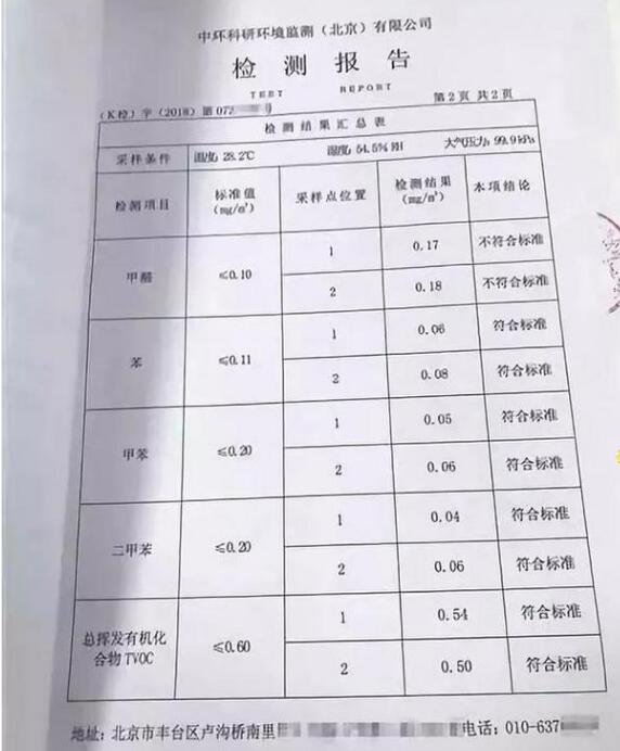 不久,姚某和朋友要求对房屋空气质量进行第三方检测,自如方承诺,如检测出问题检测费用由自如承担。据中环科研环境检测(北京)有限公司7月30日出具的检测报告,两处采样点位置检测结果分别为0.17毫克每立方米和0.18毫克每立方米,比《室内空气质量标准》规定的0.1毫克每立方米标准值高出近1倍。