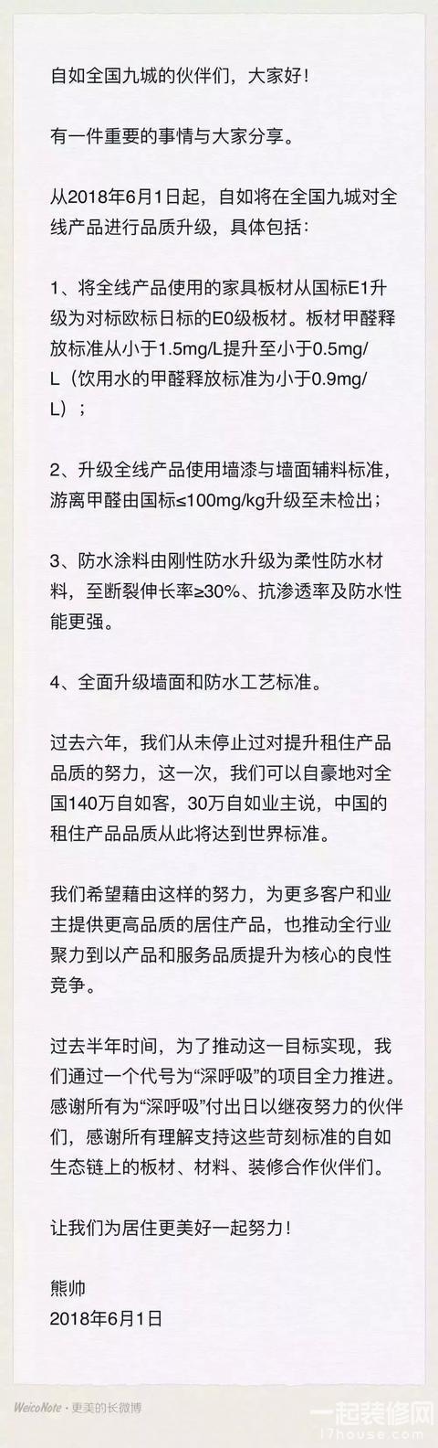 自如CEO熊帅在今年6月份宣布品牌升级时曾表示过,自如全线使用的家具板材由原来的国标E1升级为对标欧标日标的E0级板材;板材甲醛释放标准由小于1.5mg/L提升至小于0.5mg/L;升级墙漆和辅料使用标准......